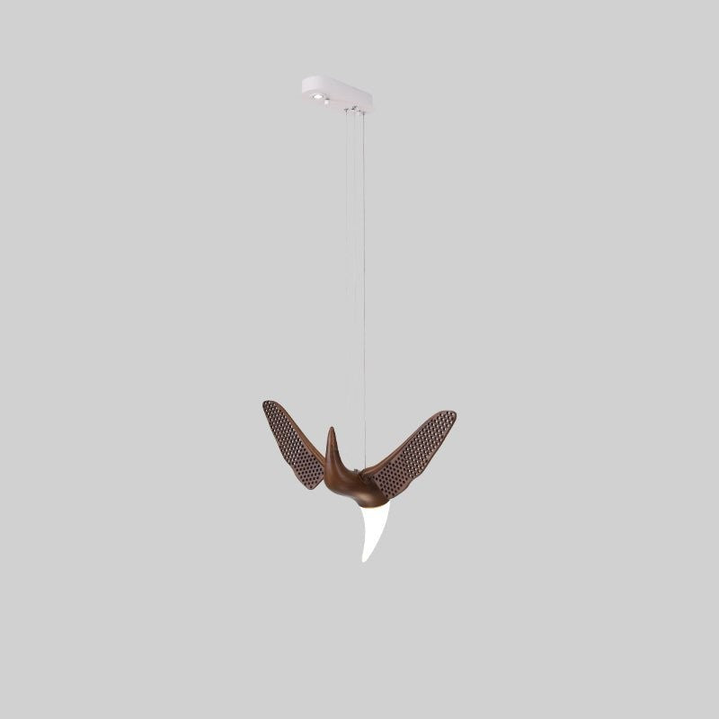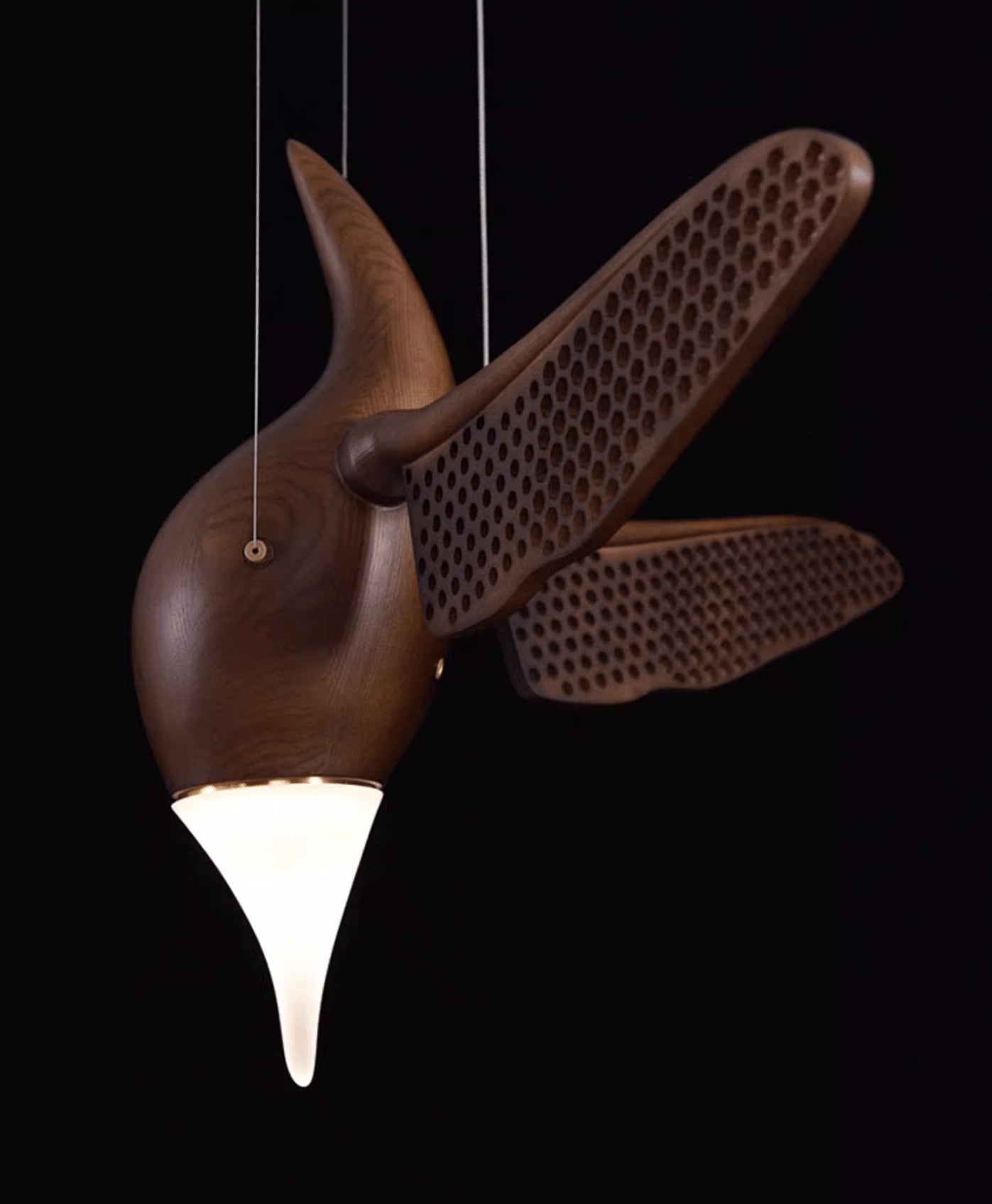 This pendant light captures a moment of motion, with sculpted wooden birds suspended mid-flight. Soft light glows upward through white diffusers, creating a playful yet refined atmosphere. It’s a striking centerpiece for living rooms, children’s spaces, or creative interiors that celebrate imagination.